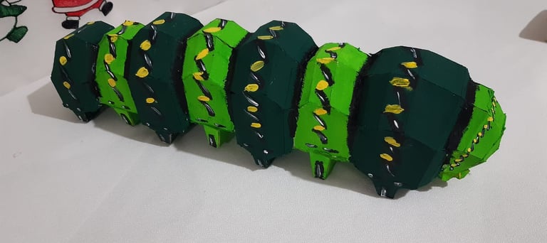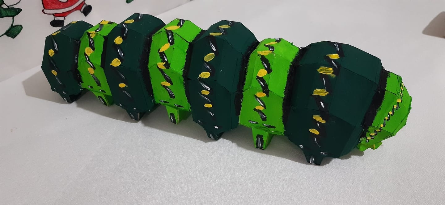 Para la versión actual utilizamos papel cascarón cortamos las piezas en menor tamaño y las ensamblamos lo pintamos de verde y lo pegamos .