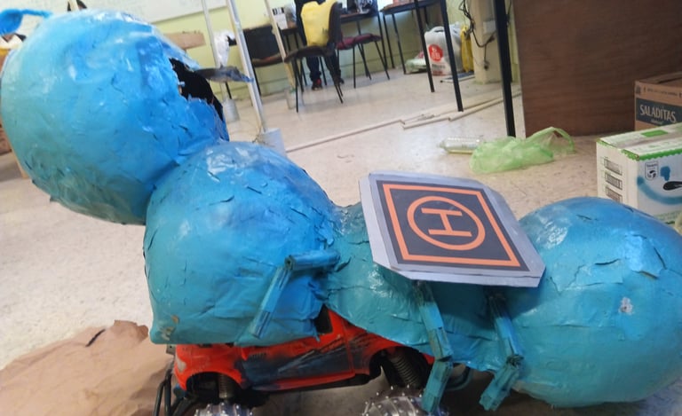 Para poder hacer la primera versión de Hemlicht utilizamos la técnica para hacer piñatas . Luego lo pintamos de azul y le pusimos su componentes aunque nos dimos cuenta de que no era muy resistente y era muy grande